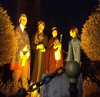 His comments were directed at an equally biblically-clad Johnny Honner (aka Innkeeper 2) who was explaining that the young lady in his company was heavily pregnant and in need of a bed for the night. They stood in the doorway to the Enniskerry Inn, dazzlingly lit by the lights of the RTE Nationwide Cameraman. It was an extraordinarily unique moment during our walk through the village with the Holy Family on Saturday last. We had congregated at the doors of St. Mary’s church and from 4:30pm onward, as the light diminished the crowds built; people joined our procession around the corner and down towards the obelisk to find three wise men bathed in orange light, fully confused by the appearance of a bright star.